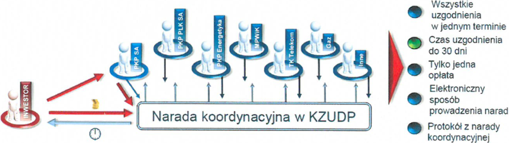 “W PKP S.A. przyjęty został również do stosowania „Regulamin organizacji procesu narad koordynacyjnych – uzgadniania usytuowania projektowanych sieci uzbrojenia terenu na terenach zamkniętych oraz zasad i trybu koordynowania ich usytuowania na projekcie”, wprowadzający na kolejowych terenach zamkniętych uzgadnianie projektowanych sieci uzbrojenia terenu w formie narad koordynacyjnych i tym samym ujednolicił sposób uzgadniania usytuowania sieci uzbrojenia terenu z procedurami obowiązującymi w starostwach. W ramach „jednego okienka”, PKP S.A. umożliwiła inwestorom i projektantom składanie wniosków na narady koordynacyjne za pośrednictwem systemu Specjalistycznej Mapy Obiektów Kolejowych (SMOK), prowadzonej przez Kolejowe Ośrodki Dokumentacji Geodezyjnej i Kartograficznej (KODGiK). Na platformie eKODGiK, służącej do elektronicznej obsługi klienta, dodano nowy wniosek – „Wniosek o przeprowadzenie narady koordynacyjnej na kolejowym terenie zamkniętym”.“