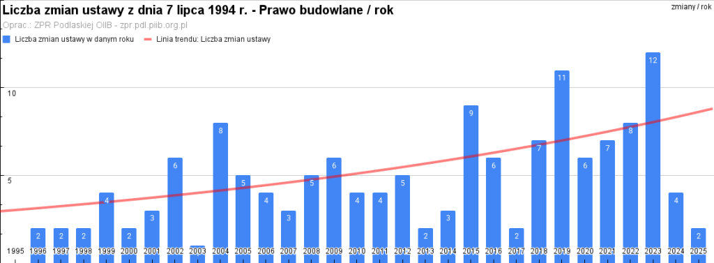 W ostatnich dwóch latach widać wyraźną zmianę tendencji jesli chodzi o liczbę zmian Prawa budowlanego. Przez cały 2025 rok miały miejsce tylko dwie zmiany!